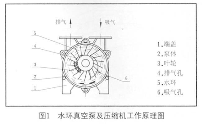??如圖1所示,葉輪3偏心地安裝在泵體2內,因此當葉輪3旋轉時,水受離心力的作用而在泵體內壁形成一旋轉水環(huán)5,水環(huán)上部內表而與輪轂相切沿箭頭方向旋轉,在前半轉過程中,水環(huán)內表面逐漸與輪轂脫離,因此在葉輪葉片間與水環(huán)形成封閉空問,隨著葉輪的旋轉,該空間逐漸擴大,空間氣體壓力降低.氣體被吸入空間:在后半轉過程中, 水環(huán)內表面漸漸與輪轂禹靠近,葉片間的空間逐漸縮小,空間氣體壓力升高,高于排氣口壓力時,葉片間的氣體被排出, 如此葉輪每轉動一周,葉片間的空間吸排一次,許多空間不停地工作,泵就連續(xù)不斷地抽吸或壓送氣體。